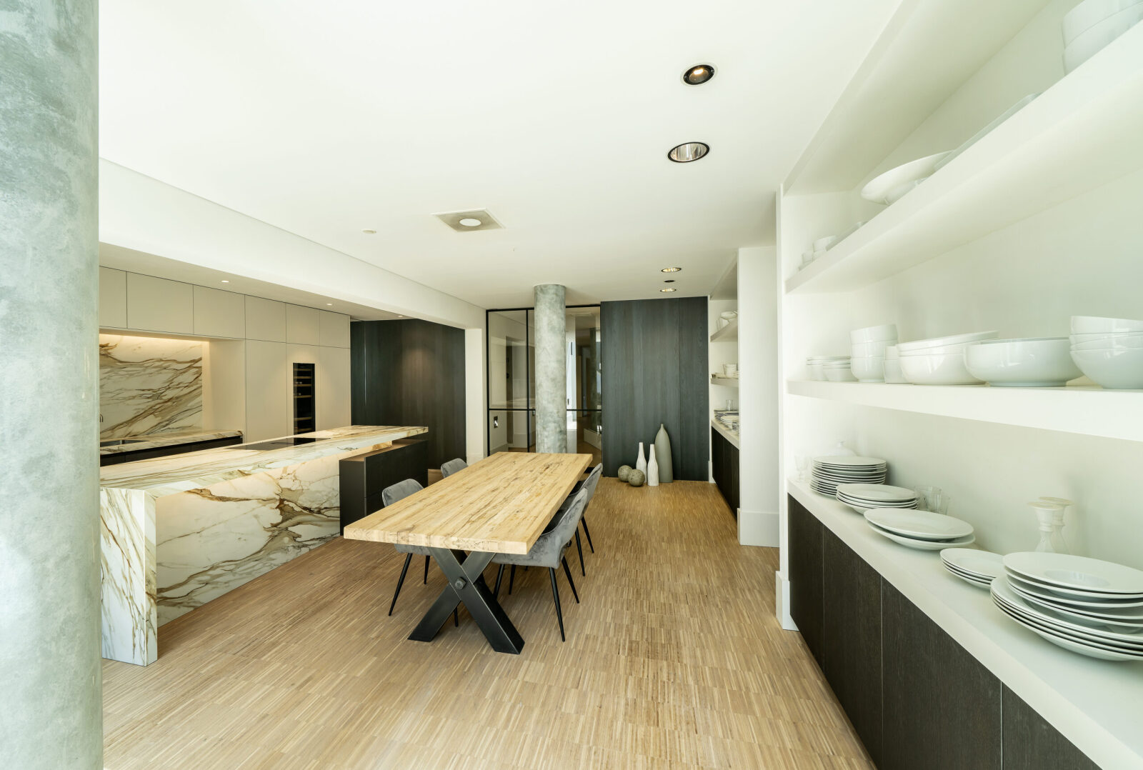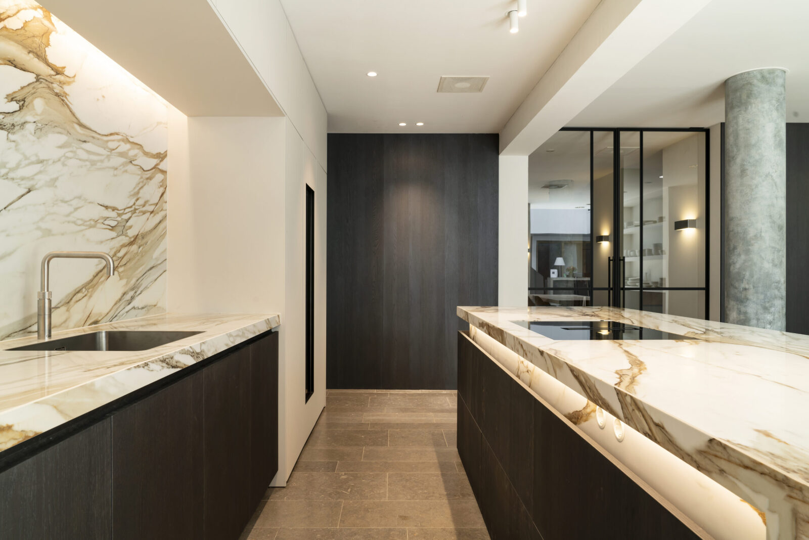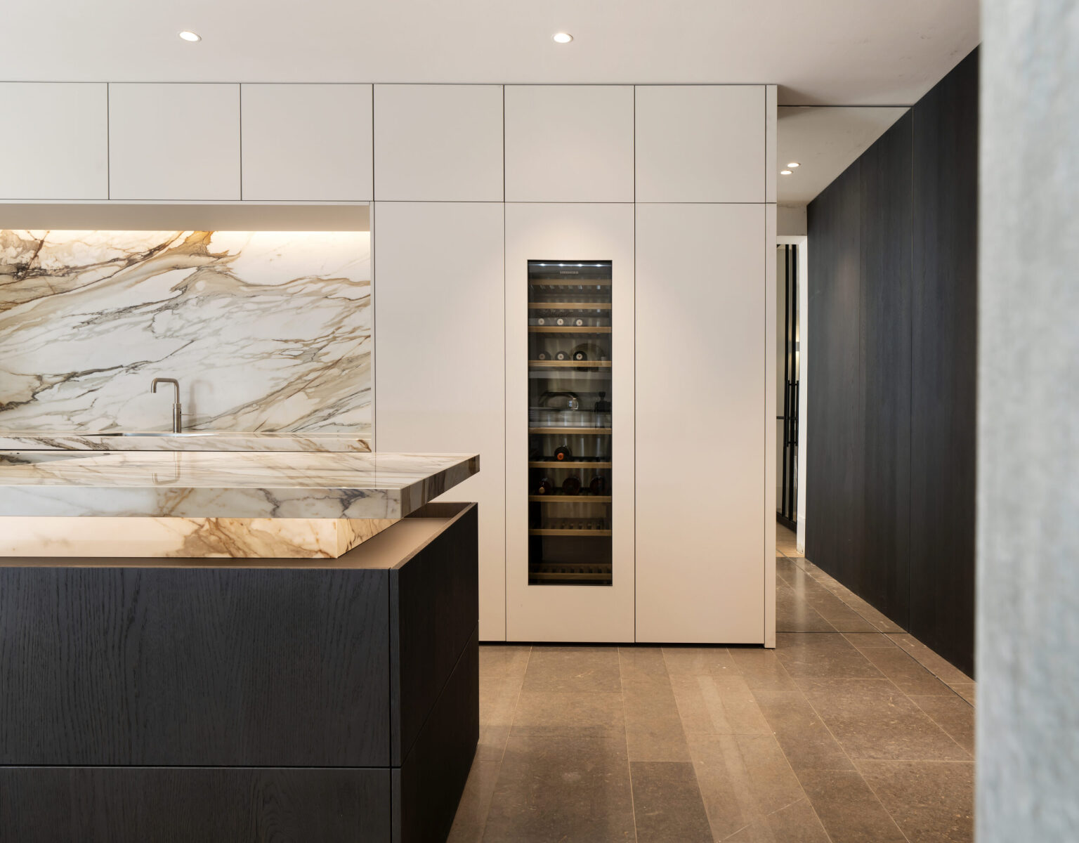 Deze luxueuze keuken combineert tijdloze elegantie met moderne functionaliteit. Het royale kookeiland is uitgevoerd in warm eikenfineer, perfect in balans met het gouden keramiek dat over het volledige eiland doorloopt. Deze naadloze overgang geeft de keuken een speelse maar tegelijkertijd harmonieus verfijnde uitstraling.